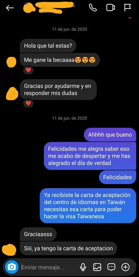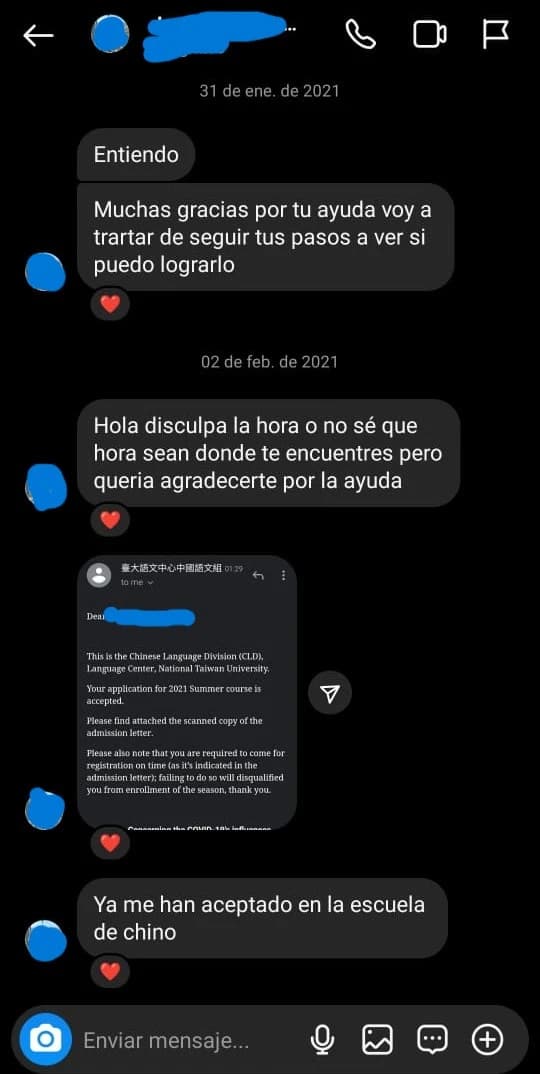 - Estudiante de chino mandarín en la Universidad de Chung Hua, patrocinada por el Gobierno de Taiwán (MOFA Scholarship)